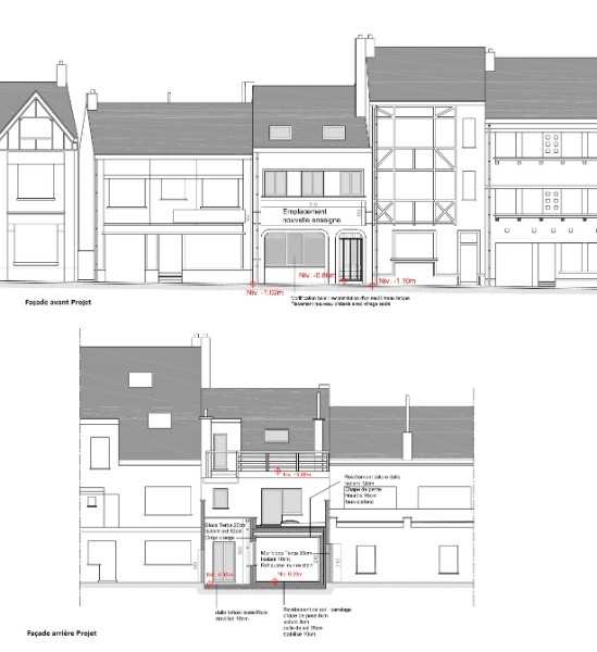 Le corps du bâtiment sera rénové pour accueillir les nouveaux cabinets médicaux. Un nouveau volume secondaire viendra compléter l'ensemble. Ce volume viendra combler la zone de coure actuelle et présentera une toiture plate végétalisée qui permettra la liaison avec l'actuelle zone jardin.